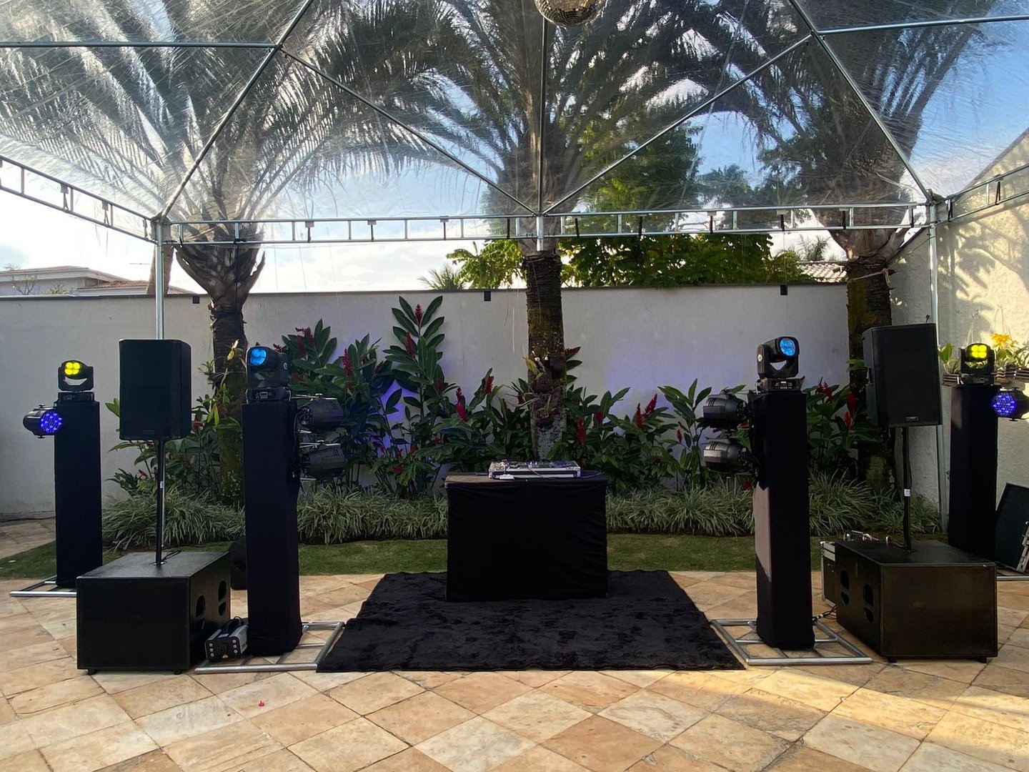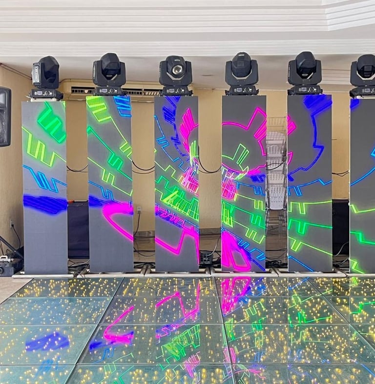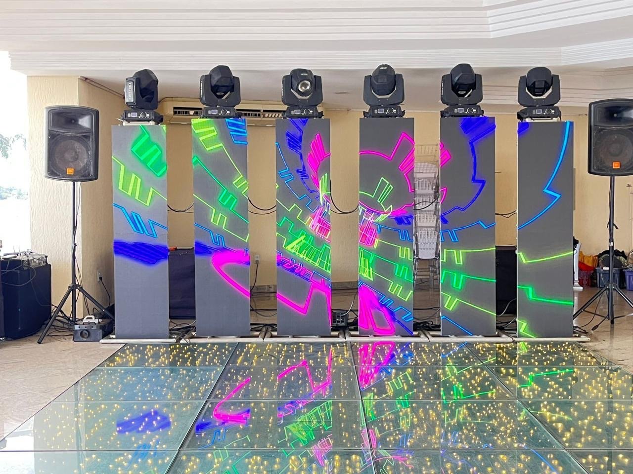 Aluguel de equipamentos de som, iluminação, estruturas de palco e piso.